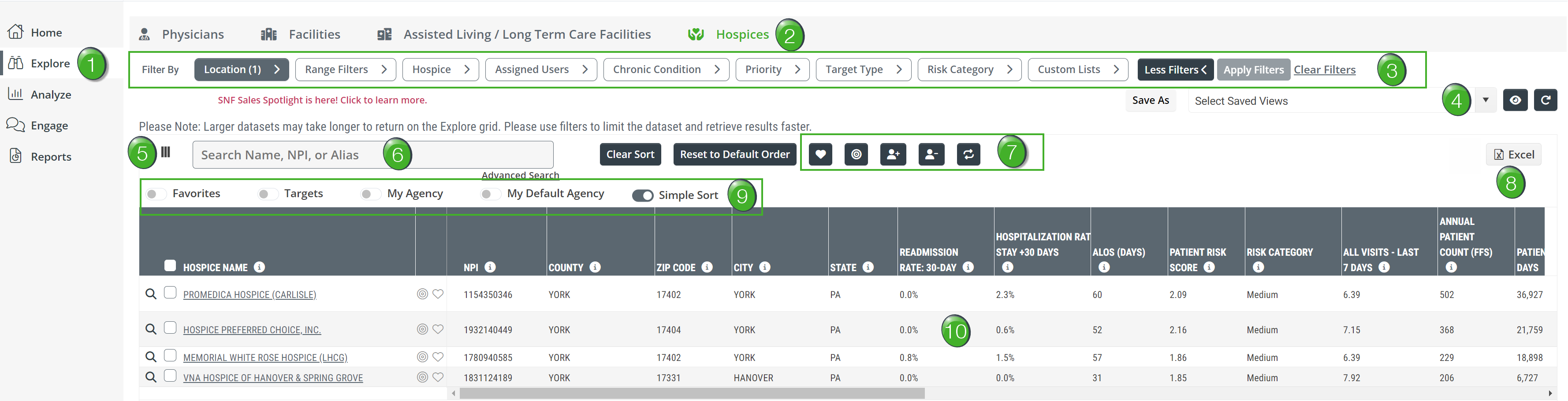 On the Physicians Explore page and the Facilities Explore page, the primary use case is to target specific providers for attention as potential referral sources. The Hospices Explore page is useful for comparing your hospice with other hospices to evaluate your competitive position. If you are developing new business and want to look for a potential merger or acquisition, this table will help you to evaluate hospices with potential.